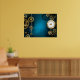Turquoise, textured, steampunk background with brass and gold gears, a silver key and the clock. Steampunk style.