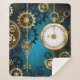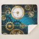 Turquoise, textured, steampunk background with brass and gold gears, a silver key and the clock. Steampunk style.