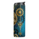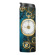 Turquoise, textured, steampunk background with brass and gold gears, a silver key and the clock. Steampunk style.