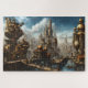 A fantasy steampunk city under construction, with a clock in the foreground and a crane in the background, makes a terrific jigsaw puzzle.