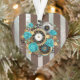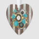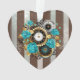 Patterned, antique watch, adorned with jewelry, gold hour hands and Latin numerals with turquoise roses on brown, striped background. Steampunk style.