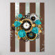 Steampunk Clock and Turquoise Roses on Striped Poster