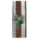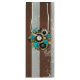 Patterned, antique watch, adorned with jewellery, gold hour hands and Latin numerals with turquoise roses on brown, striped background. Steampunk style.