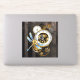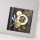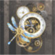 Antique dials with gold and brass gears, decorated with mechanical dragonfly on brown, striped background. Steampunk.