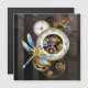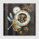 Antique dials with gold and brass gears, decorated with mechanical dragonfly on brown, striped background. Steampunk.