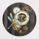 Antique dials with gold and brass gears, decorated with mechanical dragonfly on brown, striped background. Steampunk.