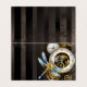 Antique dials with gold and brass gears, decorated with mechanical dragonfly on brown, striped background. Steampunk.
