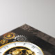 Antique dials with gold and brass gears, decorated with mechanical dragonfly on brown, striped background. Steampunk.