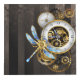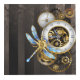 Antique dials with gold and brass gears, decorated with mechanical dragonfly on brown, striped background. Steampunk.