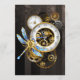 Antique dials with gold and brass gears, decorated with mechanical dragonfly on brown, striped background. Steampunk.