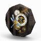 Antique dials with gold and brass gears, decorated with mechanical dragonfly on brown, striped background. Steampunk.