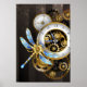 Antique dials with gold and brass gears, decorated with mechanical dragonfly on brown, striped background. Steampunk.