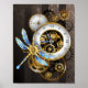 Antique dials with gold and brass gears, decorated with mechanical dragonfly on brown, striped background. Steampunk.