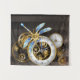 Antique dials with gold and brass gears, decorated with mechanical dragonfly on brown, striped background. Steampunk.