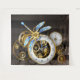 Antique dials with gold and brass gears, decorated with mechanical dragonfly on brown, striped background. Steampunk.