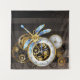 Antique dials with gold and brass gears, decorated with mechanical dragonfly on brown, striped background. Steampunk.