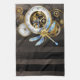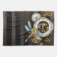 Antique dials with gold and brass gears, decorated with mechanical dragonfly on brown, striped background. Steampunk.