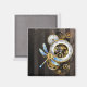 Antique dials with gold and brass gears, decorated with mechanical dragonfly on brown, striped background. Steampunk.