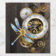 Antique dials with gold and brass gears, decorated with mechanical dragonfly on brown, striped background. Steampunk.