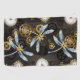 Antique dials and keys with gold and brass gears, decorated with mechanical, steampunk dragonflies on brown, striped background.