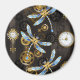 Antique dials and keys with gold and brass gears, decorated with mechanical, steampunk dragonflies on brown, striped background.
