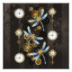 Antique dials and keys with gold and brass gears, decorated with mechanical, steampunk dragonflies on brown, striped background.