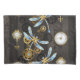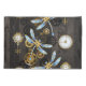 Antique dials and keys with gold and brass gears, decorated with mechanical, steampunk dragonflies on brown, striped background.