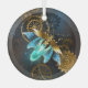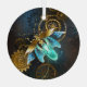 Steampunk firefly with blue transparent wings and green light bulb on worn, brown, textured background. Steampunk style.