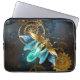Steampunk firefly with blue transparent wings and green light bulb on worn, brown, textured background. Steampunk style.