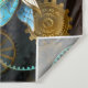 Steampunk firefly with blue transparent wings and green light bulb on worn, brown, textured background. Steampunk style.