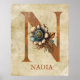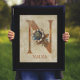 Poster print featuring a Steampunk floral and rusted metal look letter "N" on a vintage lace and parchment background. Available in print and digital download format.