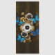 Composition of round steampunk clock with black Roman numeral dial, decorated with gold and brass gears, blue Morpho butterflies and damaged lenses on brown striped background. Steampunk style.