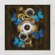 Composition of round steampunk clock with black Roman numeral dial, decorated with gold and brass gears, blue Morpho butterflies and damaged lenses on brown striped background. Steampunk style.