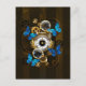 Composition of round steampunk clock with black Roman numeral dial, decorated with gold and brass gears, blue Morpho butterflies and damaged lenses on brown striped background. Steampunk style.