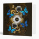 Composition of round steampunk clock with black Roman numeral dial, decorated with gold and brass gears, blue Morpho butterflies and damaged lenses on brown striped background. Steampunk style.