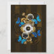 Composition of round steampunk clock with black Roman numeral dial, decorated with gold and brass gears, blue Morpho butterflies and damaged lenses on brown striped background. Steampunk style.