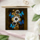 Composition of round steampunk clock with black Roman numeral dial, decorated with gold and brass gears, blue Morpho butterflies and damaged lenses on brown striped background. Steampunk style.