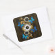 Composition of round steampunk clock with black Roman numeral dial, decorated with gold and brass gears, blue Morpho butterflies and damaged lenses on brown striped background. Steampunk style.