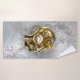 Conceptual, mechanical, human head with antique manometer and metal gears against grey industrial background. Steampunk style.