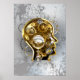 Conceptual, mechanical, human head with antique manometer and metal gears against gray industrial background. Steampunk style.