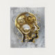 Conceptual, mechanical, human head with antique manometer and metal gears against grey industrial background. Steampunk style.