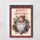 Unique Holiday card features a vintage-style Steampunk santa with retro cool hipster shades on a festive tartan background, Personalize your greeting with customizable text in a vintage font. This digital art design was created with the help of AI software.
