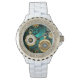 Jewellery, gold watch with a gold chain and keys on a green textural background. Steampunk style.