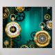 Jewellery, gold watch with a gold chain and keys on a green textural background. Steampunk style.