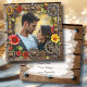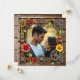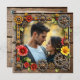 Cool and unique wedding wedding RSVP cards. Steampunk themed with gold, yellow and red metal gears, flowers and a rustic wood background. Upload your favourite picture in the personalize area and edit the text on the back to add your wedding reception meal choices.