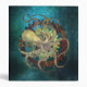 Steampunk inspired industrial rusty clockwork gears, and octopus design on a vibrant blue patina background.
