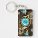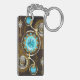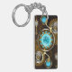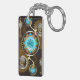 Turquoise lenses with antique watch with brass gears and golden keys on rusty, brown background. Steampunk style.