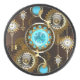 Turquoise lenses with antique watch with brass gears and golden keys on rusty, brown background. Steampunk style.