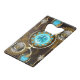 Turquoise lenses with antique watch with brass gears and golden keys on rusty, brown background. Steampunk style.