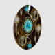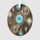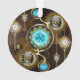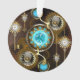 Turquoise lenses with antique watch with brass gears and golden keys on rusty, brown background. Steampunk style.